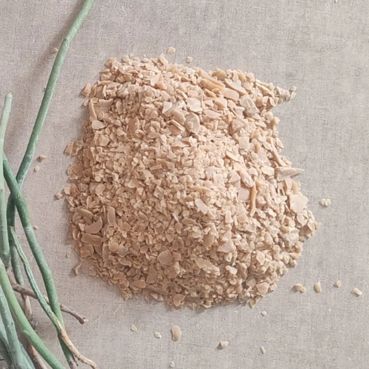 Cera de candelilla refinada en forma de pequeños gránulos o escamas. Esta presentación facilita su manejo, dosificación y fusión uniforme, siendo comúnmente utilizada en formulaciones cosméticas, farmacéuticas y alimentarias.