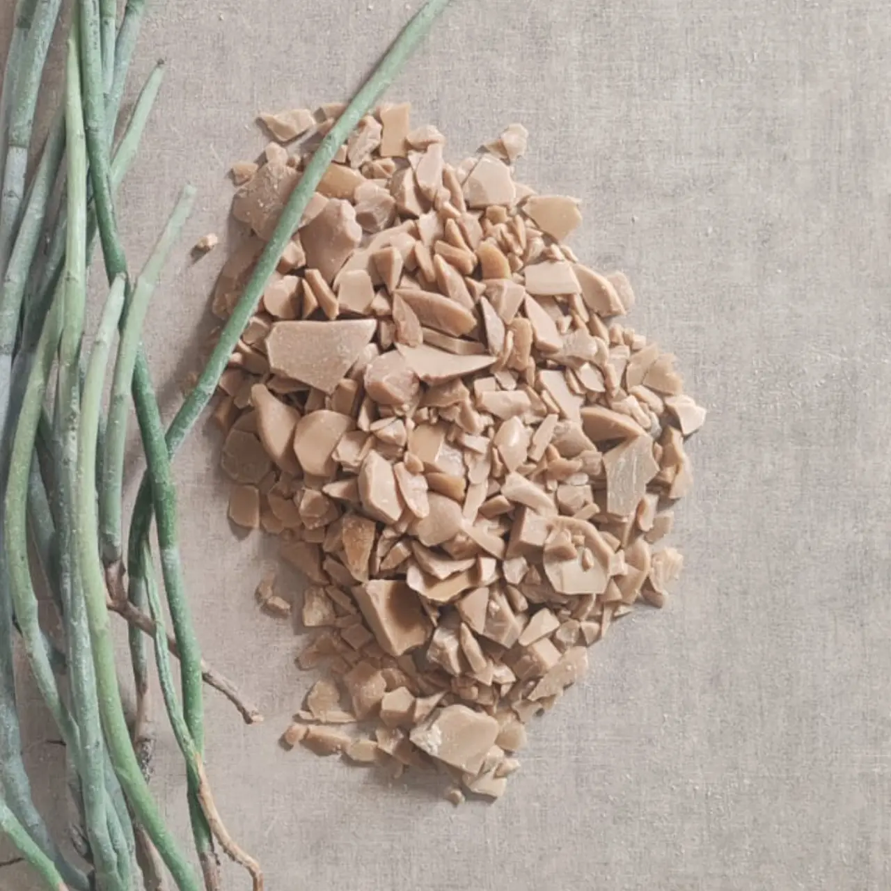 Fragmentos irregulares de cera de candelilla refinada. Recomendado para procesos donde se requiere una fusión directa del producto sin molienda previa, conservando su composición natural y calidad.